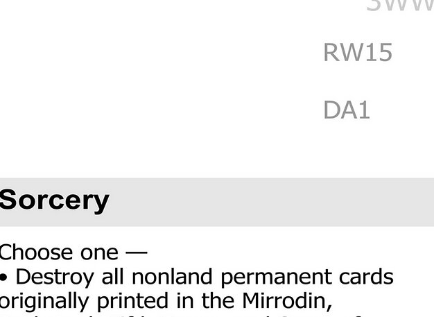• Destroy all nonland permanent cards originally printed in the Mirrodin, Darksteel, Fifth Dawn, and Scars of Mirrodin expansions.